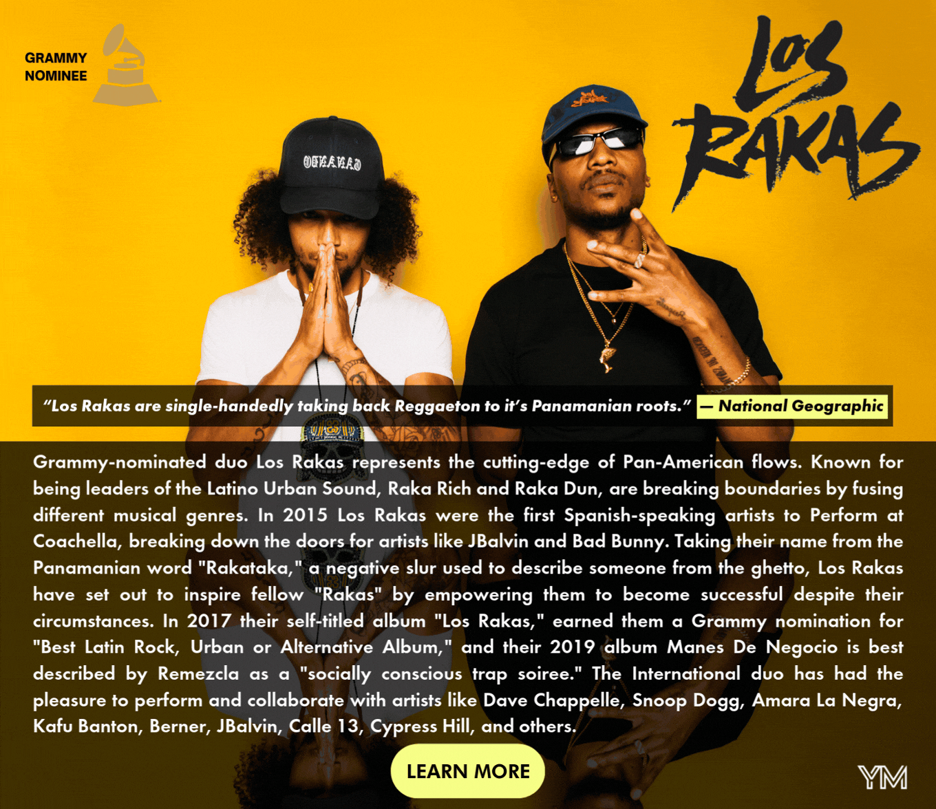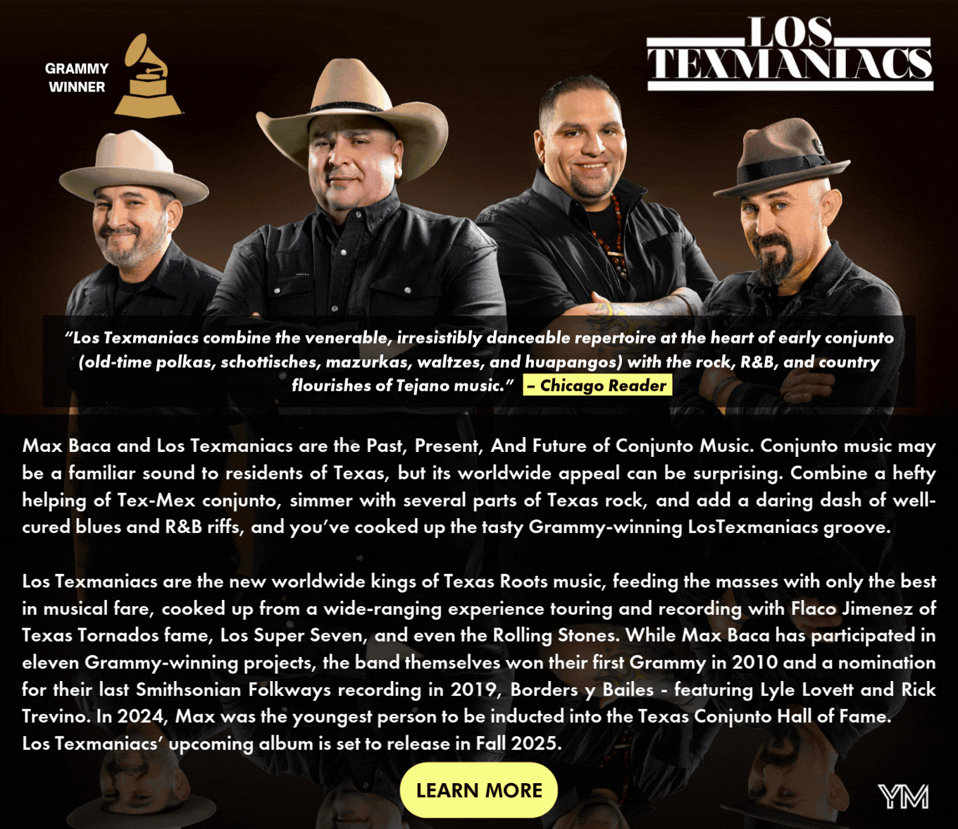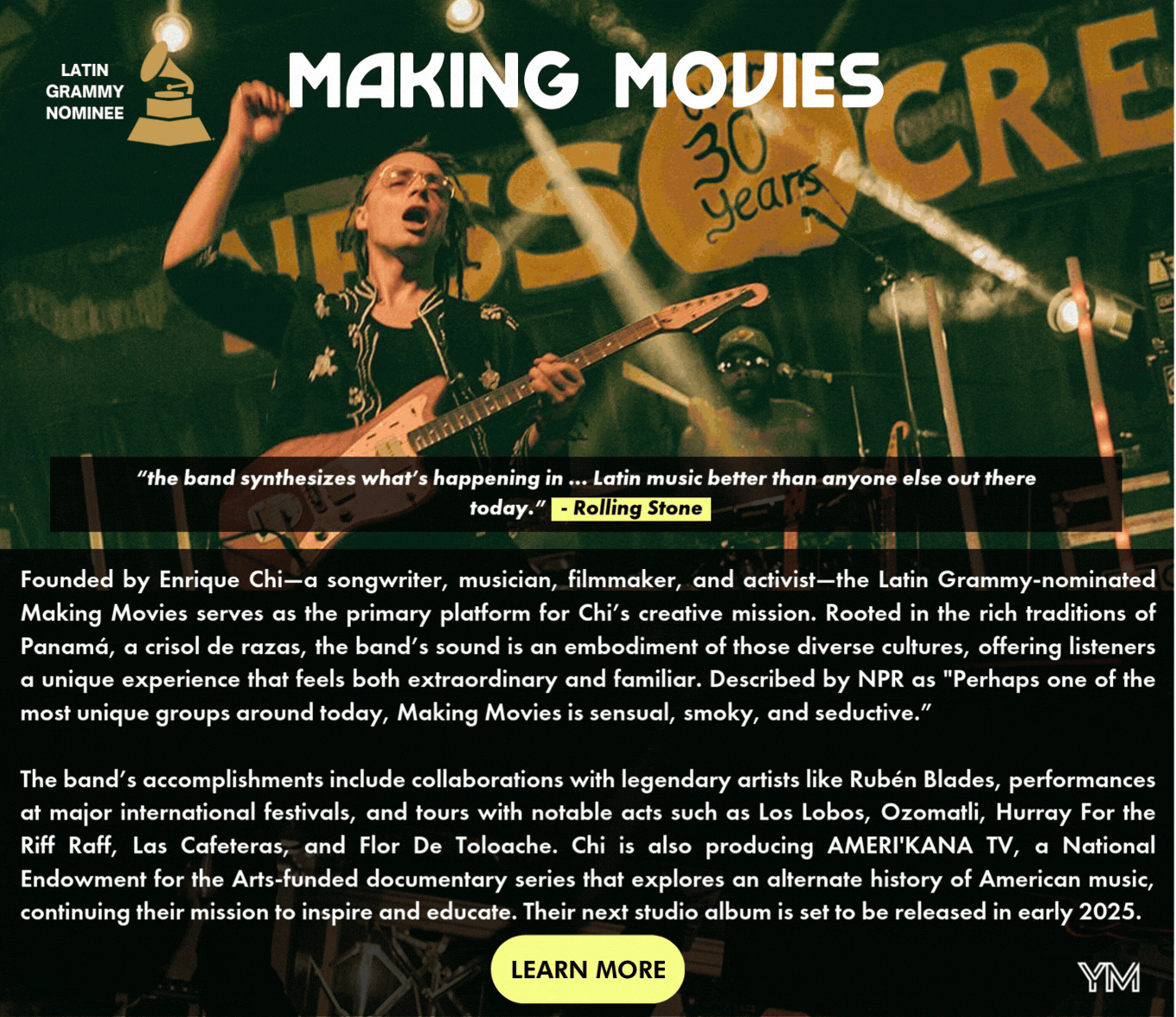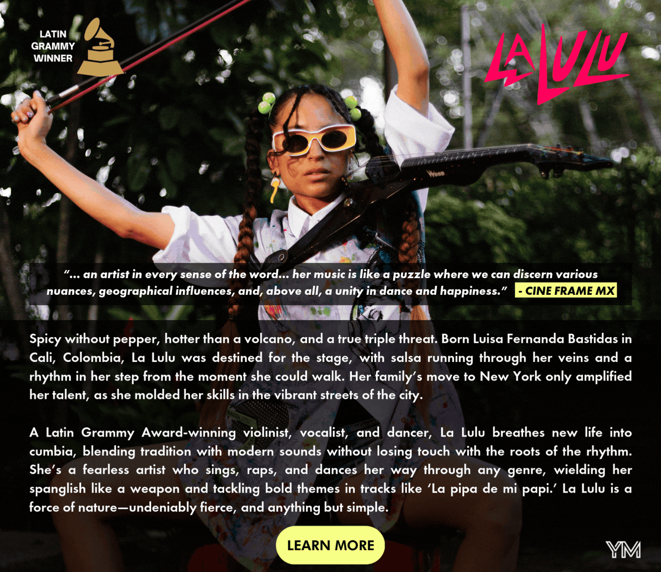 Seven time Latin GRAMMY winner Rubén Albarrán, known for blending Mexican folklore with modern rock rhythms, will be touring North America and Europe in 2025 in support of his first solo album Narciso Reyna . Rubén’s other projects include his rockabilly band The K'comxtles and Pinche Pinchadiscos (his DJ alias). Latin GRAMMY nominated Making Movies continues to push the boundaries of American music with a sound Rolling Stone describes as “an eclectic blend of rumbero percussions, delicate organs, and grungy fuzz rock” and will release their next studio album in the spring. Two time GRAMMY winners Los Texmaniacs are the past, present, and future of Conjunto music featuring Max Baca on the bajo sexto and his nephew Josh Baca, who is fast attaining legendary status on the accordion. They were inducted into the Conjunto Music Hall of Fame in 2024 alongside Los Tigres Del Norte and will also release a new studio album in 2025. Grammy nominated Afro-Latino duo Los Rakas (the first Urbana group to play Coachella) are touring in support of the release of their latest album La Raka Zaza. La Lulu, a Latin Grammy-winning artist from Cali, Colombia, is a dynamic force blending traditional cumbia with modern sounds, bold storytelling, and genre-defying artistry. Bulla en el Barrio, led by Combo Chimbita founders, brings the essence of traditional Bullerengue music, transporting audiences to the heart of Colombian folk culture. Bulla just released their new album VÁMONOS que nos VAMOS. Also originally from Colombia, Alea’s performances encompass an entire generation of ethno-futuristic and folkloric music accentuated by buttery vocals, deep-rooted grooves, and uplifting guitar.