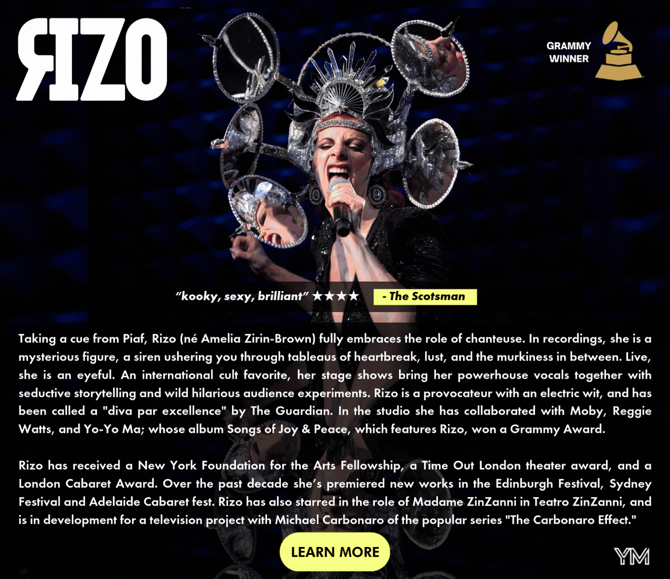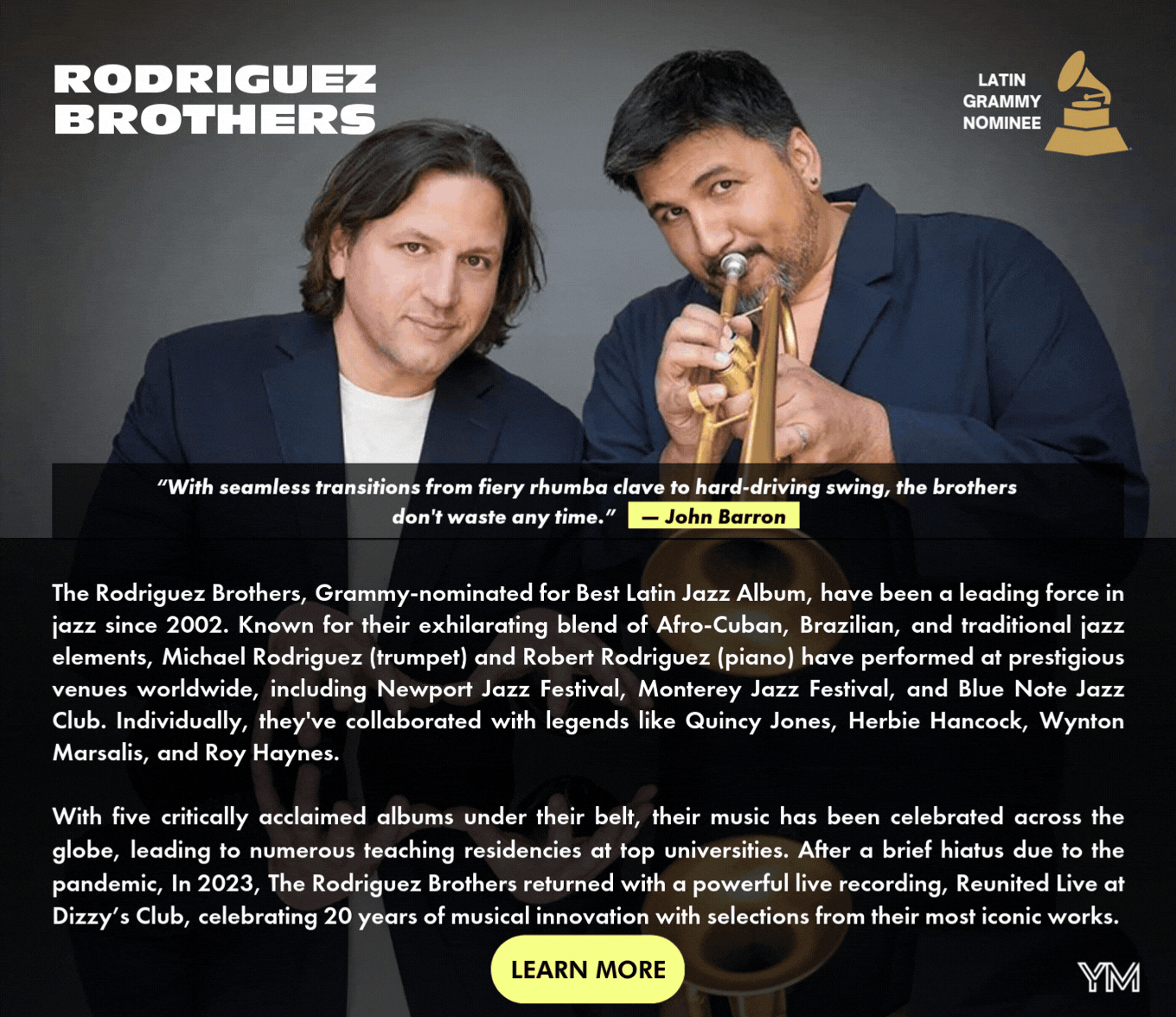 Trap Jazz, led by Atlanta-born piano prodigy Chris Moten, revolutionizes jazz by blending the rhythms and themes of trap with the melodies of jazz. If this is your first time hearing the words Trap Jazz together, then look no further than the new docu-film by the same name, premiered exclusively on HULU. Sachal Vasandani is a vocalist and songwriter known for his singular voice, with a tone and unique phrasing that mark him as one of the most compelling artists on the scene today. His latest album, Best Life Now, is set for release Feb 14, 2025. GRAMMY nominated for Best Latin Jazz Album, The Rodríguez Brothers captivate audiences worldwide by fusing Afro-Cuban music with the spirit of jazz. Raina Sokolov-Gonzalez is a singer/composer based in Brooklyn of both Jewish and hispanic heritage. She comes from rich traditions of storytelling, and her music is rooted in jazz and soul. GRAMMY winner Rizo uses her trademark blend of songs, stories, performance art, comedy and glamour to captivate audiences worldwide.