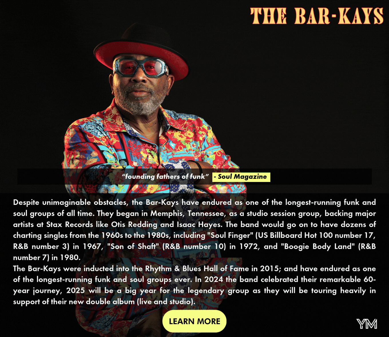 In 2024, The Bar-Kays celebrated their remarkable 60-year journey, recognized as the "founding fathers of funk" by Soul magazine. 2025 will be a big year for the legendary group as they will be touring heavily in support of their new double album (live and studio). The Sensational Barnes Brothers, Memphis-based gospel/soul group, had a breakthrough years of 23-24 captivating audiences at festivals like Rocky Mountain Folks, Sisters Folk, Freshgrass, Telluride Bluegrass, and Merlefest and will be touring the release of their 2nd studio album in 2025.